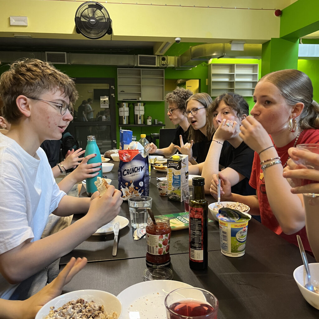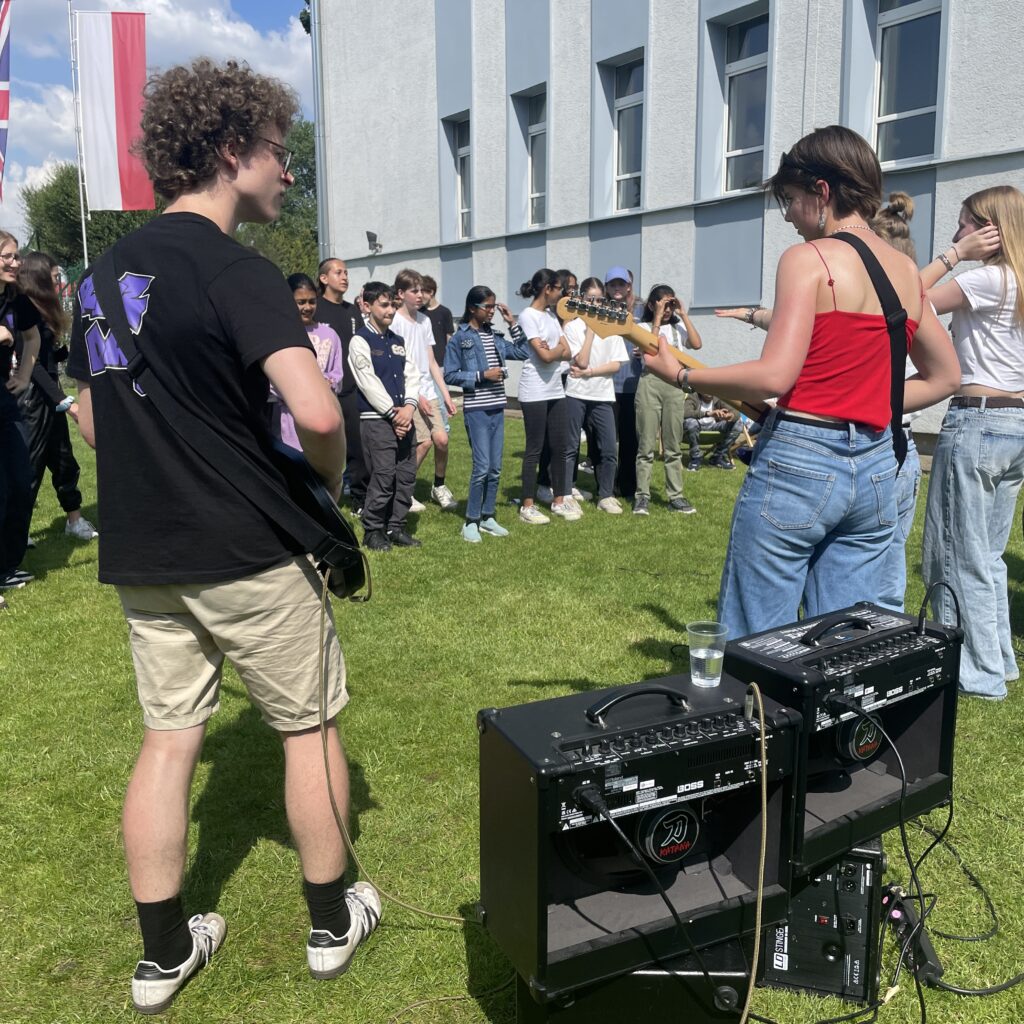 Tag 5, Mittwoch, 29.5. Der heutige fünfte Tag war der Höhepunkt der Reise nach Krakau. Wir spielten zwei Konzerte an unserer Partnerschule. Dafür sind wir nach einem kurzen Frühstück mit der Bahn wieder ein Stück in die Außenbezirke der Stadt gefahren, um zu der Schule zu gelangen. Die nächsten Stunden verbrachten wir mit Aufbauen, Soundcheck und einem Mittagessen, welches von der Schule gestellt wurde. Um halb zwei spielten wir das Konzert für die Primary School, eine Stunde später für die Highschool. Beide Auftritte waren super, wobei wir uns beim zweiten Mal noch steigern konnten. Es hat einfach super viel Spaß gemacht und die polnischen Schüler:innen haben mit ihren Tanzeinlagen das Ganze auch sehr gewürdigt. Gerne wieder! Gegen 17 Uhr waren wir wieder k.o. und glücklich in der Unterkunft. Nach ein bisschen Entspannung haben wir ein letztes Mal zusammen gekocht und den Abend mit einem kleinen Spaziergang durch die so schöne Altstadt ausklingen lassen. Morgen geht es früh mit dem Zug zurück nach Leipzig und dann ist auch die erste Konzertreise von der Band „Platz da“ – und die fünfte von dem Projekt „School on Tour“ – Geschichte.