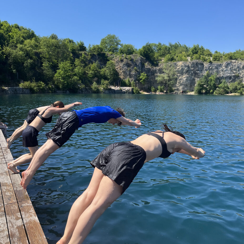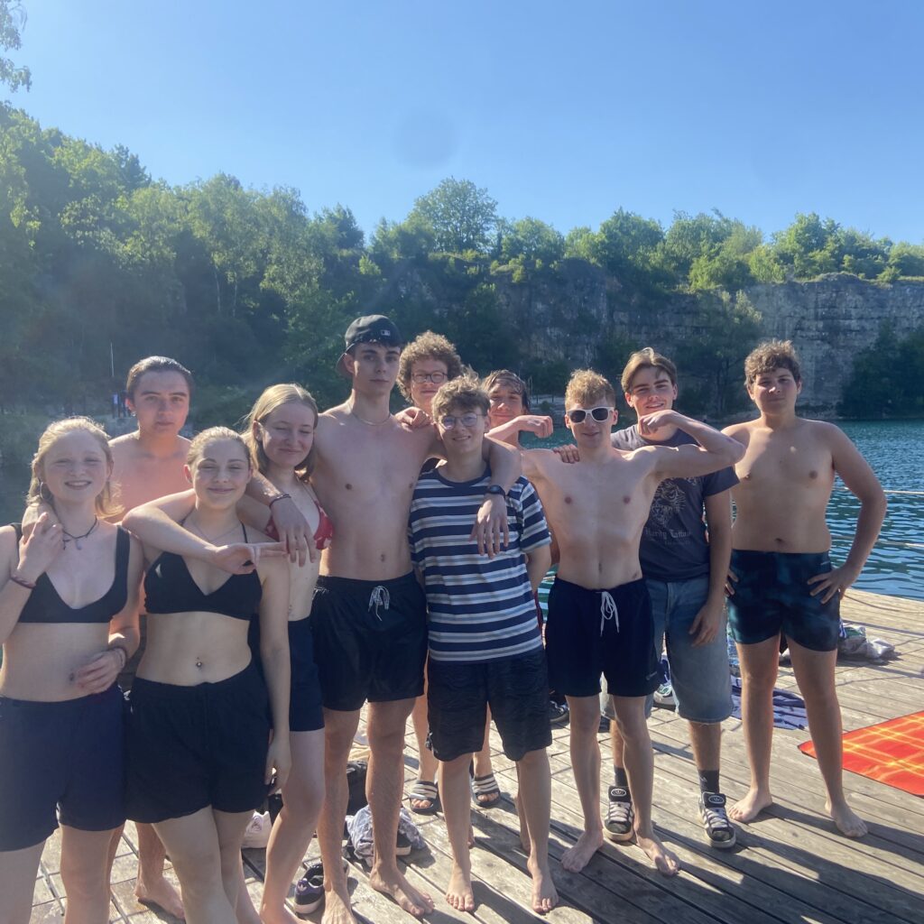 Tag 3 in Krakau, Montag, 27.5. Als wir endlich alle gut eingecremt waren – es ist hier super heiß und sonnig – setzten wir uns in eine vortrefflich akklimatisierte Bahn und fuhren zum aquamarinsten See, den unsere Augen je erblickten. Vor Ort trafen wir auf unsere Austauschschüler:innen, mit welchen wir einen sehr angenehmen Nachmittag verbrachten. Gemeinsam verbesserten wir unsere Volleyball- und Schwimmkünste. Des Weiteren unterhielten wir uns über die kulturellen Unterschiede der Länder und ganz alltägliche Themen. Nachdem wir wieder in unserer Unterkunft angekommen waren und gegessen hatten, machten wir uns fertig für einen Ausflug in die Jazzbar am sehr großen und schönen Marktplatz. Dort wurde der musikalische Teil unseres Gehirns neu aktiviert, sobald wir mit den intellektuellen Klängen einer tollen Band beschallt wurden. Es war ein unglaubliches Konzert einer Funk- und Soulband, was uns sehr berauscht hat. Nach sehr schönen eineinhalb Stunden kehrten wir wieder zurück und fielen müde ins Bett.