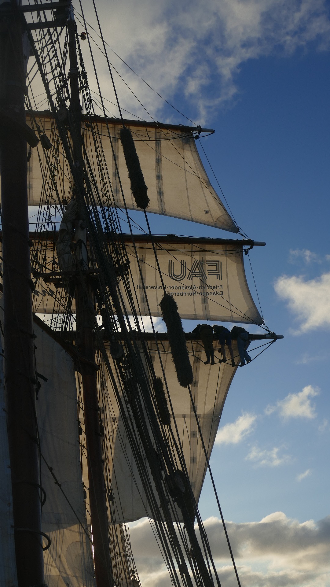 Doch diese Reise war viel mehr als nur eine Route auf einer Karte. Da war kein monotoner Alltag, sondern jeden Tag ist etwas Neues passiert. Mal flog das Mathebuch über Bord, mal stand das Segel bedienen in den 30 Meter hohen Masten bei Nachtwache an, mal das Staunen über Delfine am Bug, mal bei Seegang in der Backschaft (von früh bis spät für 50 Leute kochen) stehen, oder das Navigieren durch den Sturm.
