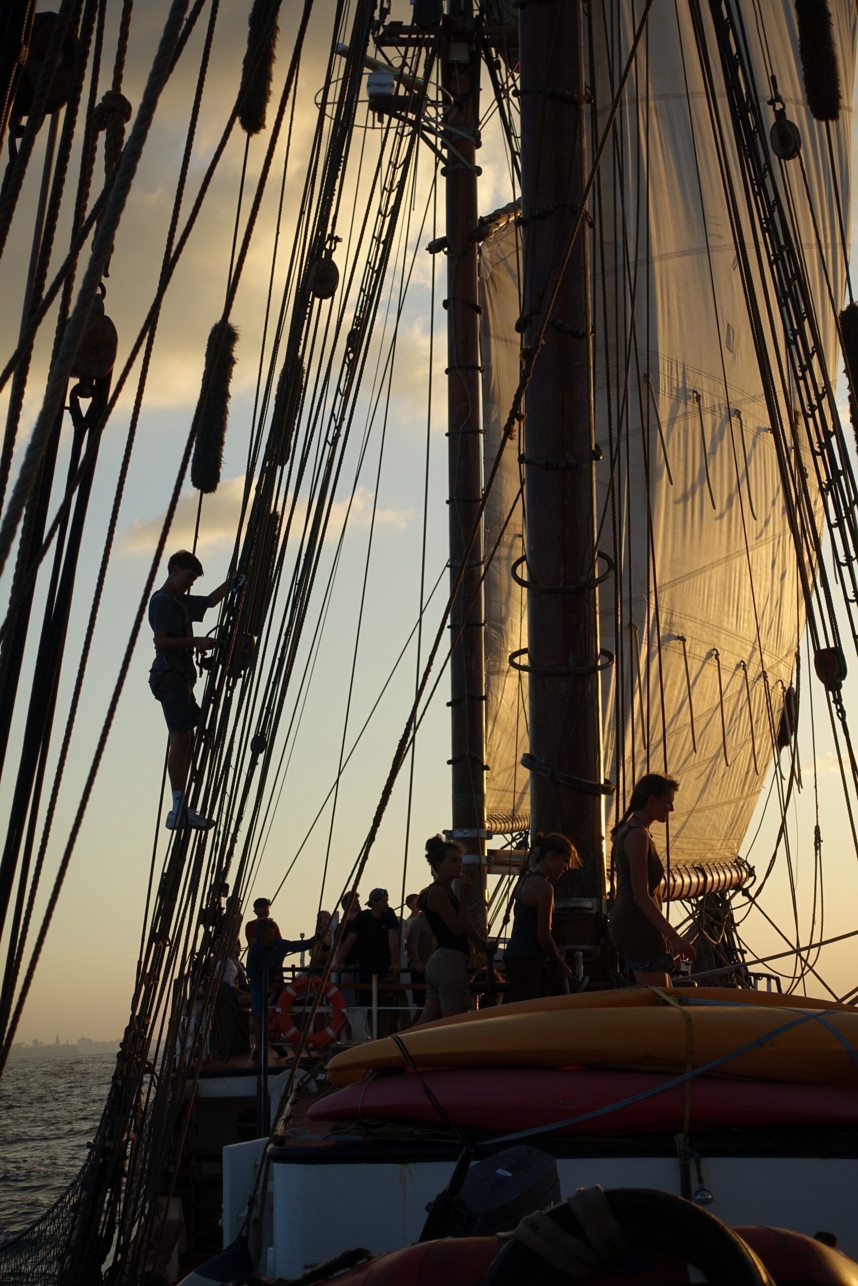 Doch diese Reise war viel mehr als nur eine Route auf einer Karte. Da war kein monotoner Alltag, sondern jeden Tag ist etwas Neues passiert. Mal flog das Mathebuch über Bord, mal stand das Segel bedienen in den 30 Meter hohen Masten bei Nachtwache an, mal das Staunen über Delfine am Bug, mal bei Seegang in der Backschaft (von früh bis spät für 50 Leute kochen) stehen, oder das Navigieren durch den Sturm.